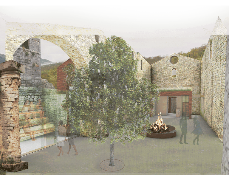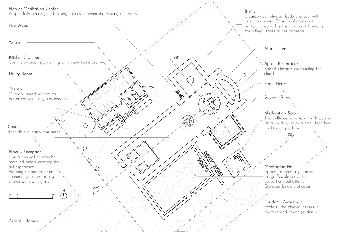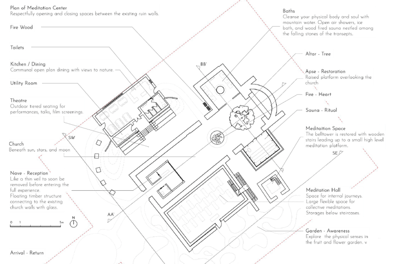 Reinstating the medieval abbey as a meditation center, integrated with facilities.